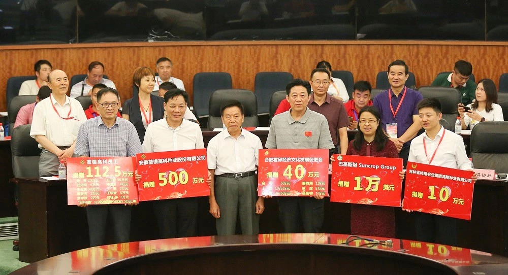會上進行了基金會2018年公益愛心捐贈儀式。荃銀高科母子公司高管和員工多次參與基金會濟困助學公益慈善活動,本次捐贈112.5萬元;吉林鴻翔種業(yè)集團鴻翔種業(yè)有限公司捐贈10萬元;巴基斯坦Suncrop Group(陽光作物集團)捐贈1萬美元;合肥霍邱經(jīng)濟文化發(fā)展促進會及會員為基金會貧困助學項目捐贈40萬元;安徽荃銀高科種業(yè)股份有限公司捐贈500萬元。