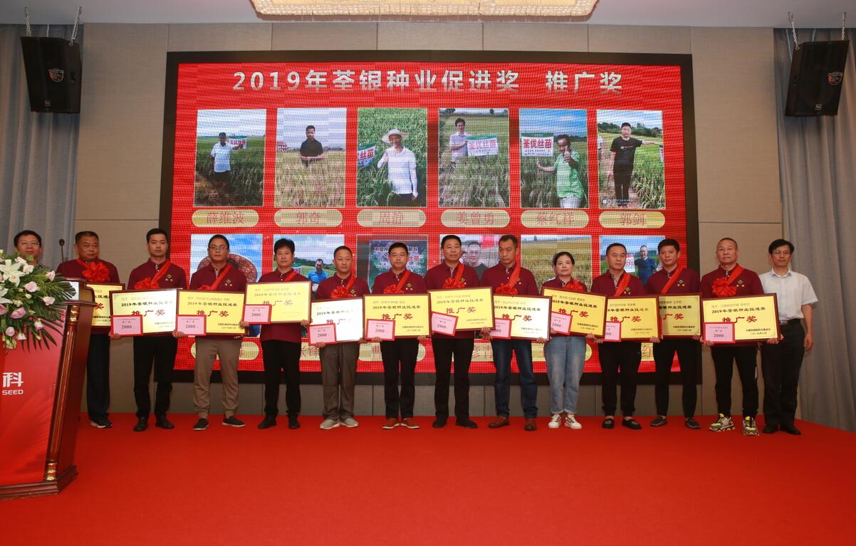 荃銀高科監事會主席謝慶軍先生(左一)、荃銀高科工會主席、安徽張海銀種業基金會監事鄭滿生先生(右一) 為“荃銀種業促進獎”推廣獎獲獎者頒獎